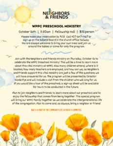 The N&F ministry is a part of the Community Life Outreach Committee. Our primary purpose is to provide social opportunities for fellowship that encourage and promote Christ centered interactions. Come and be a part of this growing and exciting ministry and do remember to bring a neighbor or friend!